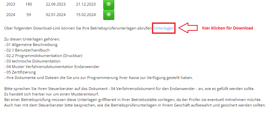 Eine Bereitstellung Ihrer Kassendaten für eine Betriebsprüfung zählt nicht zum Leistungsumfang des Softwarepflegevertrags. Für das Herunterladen der Daten aus der Kasse durch unser Serviceteam fallen zusätzliche Leistungsgebühren an.