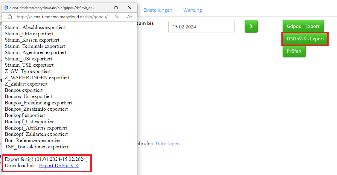 Auch den Export für die Digitale Schnittstelle der Finanzverwaltung für Kassensysteme (kurz DSFinV-K) finden Sie direkt darunter. Auch hier gilt: Datum selektieren, auf den Button DSFinV-K-Export klicken und den erstellten Ordner per Klick auf den Downloadlink herunterladen:
