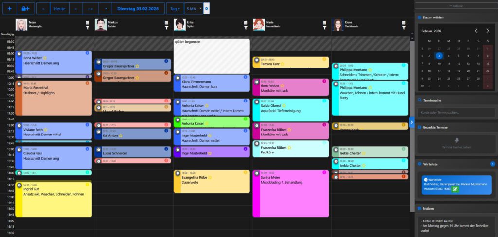 Der Kalender bezieht seine Daten und Einstellungen (u.a. Mitarbeiter und Leistungen) aus den Stammdaten des Kassensystems. Dies gilt sowohl für die lokalen als auch für die Online-Buchungen.