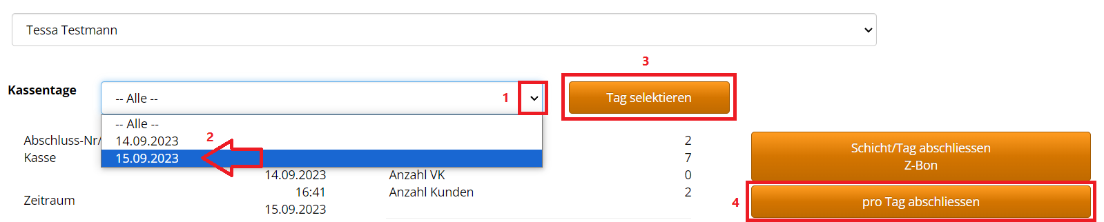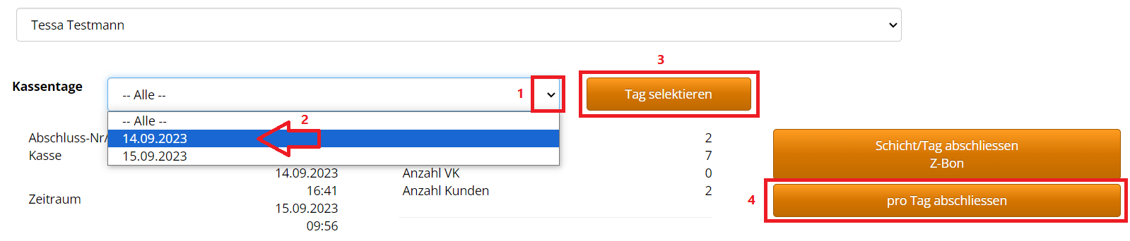 1 + 2: Zuerst das Datum auswählen, bis zu dem die Tage abgeschlossen werden sollen.