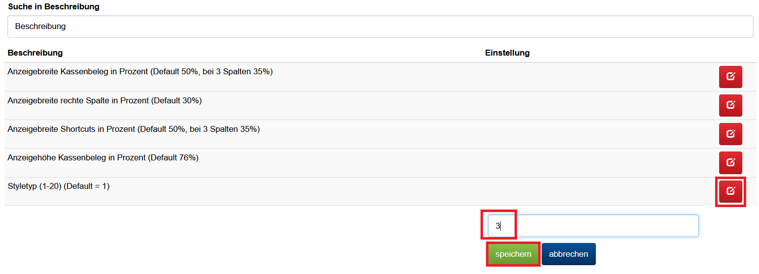 In TiM.POS gibt es 20 verschiedene Designs zur Auswahl. Sie können ein Design beliebig oft einstellen, indem Sie eine Zahl von 1 bis 20 bei „Styletyp (1-20)“ über den roten Button rechts eingeben und speichern.