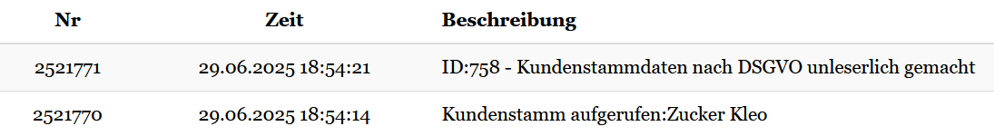 1. Der Kunde wurde nach Bestimmungen der DSGVO über das Kundenprotokoll in den Kundenstammdaten entfernt. Dies löscht den Kunden zwar aus den Stammdaten und verhindert so zukünftige Buchungen und Einträge, jedoch entfernt es nicht die bereits gebuchten Belege.