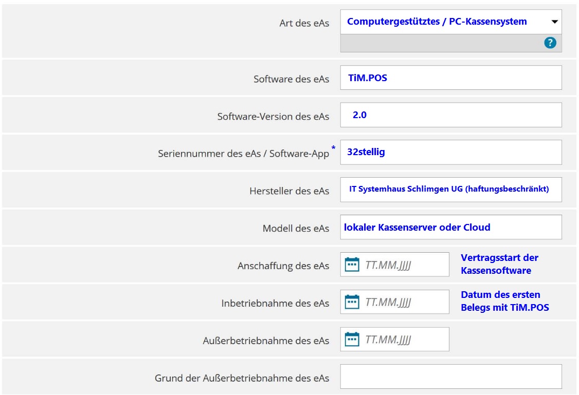 Alle Angaben welche mit einem * versehen sind, finden sich ausschließlich im Kassensystem unter Zahnrad → Tagesabschluss → KassenSichV → Einrichtung.