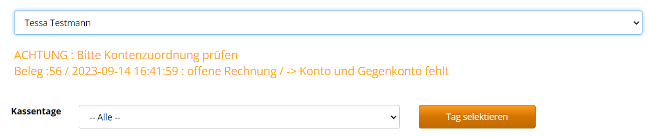 Kassieren Sie einen Beleg, bei dem eins der benötigten Konten fehlt, erscheint in der Buchhaltung eine entsprechende Fehlermeldung (siehe Bild).
